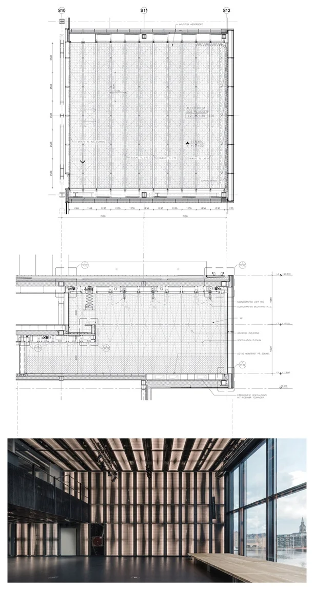 Section of acoustic and lighting panels, made in collaboration with the lighting designer Ducks Sceno.