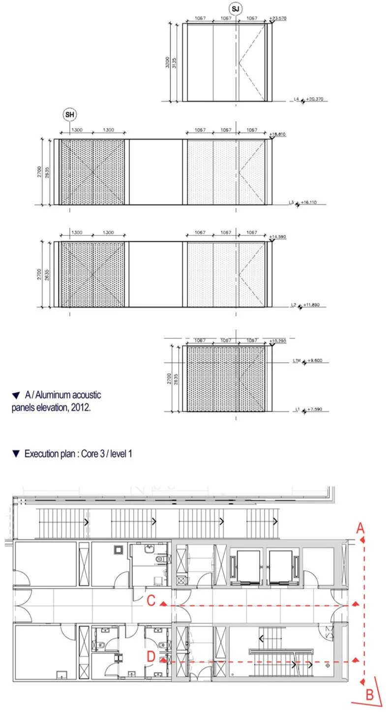 Dark tinted black for the concrete core - Gold mesh for Shaft access/acoustic panels