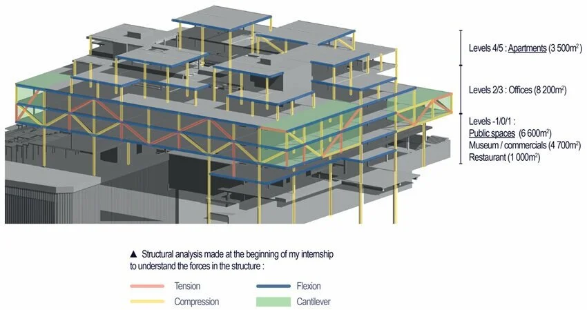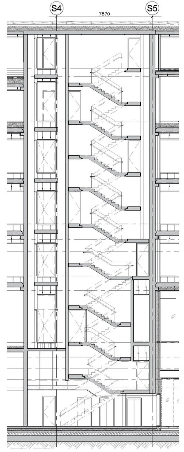 - espaces publics, cafétéria, bureaux, auditorium, salle d’exposition, circulations verticales, escaliers et 22 appartements.