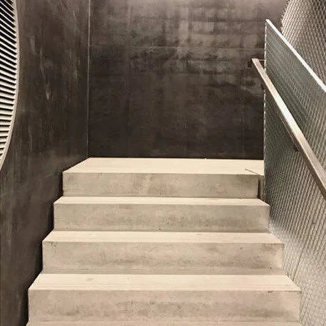 Dark concrete - Light grey concrete stair - Stainless steel railing - Grating handrail - Brushed aluminum technical elements