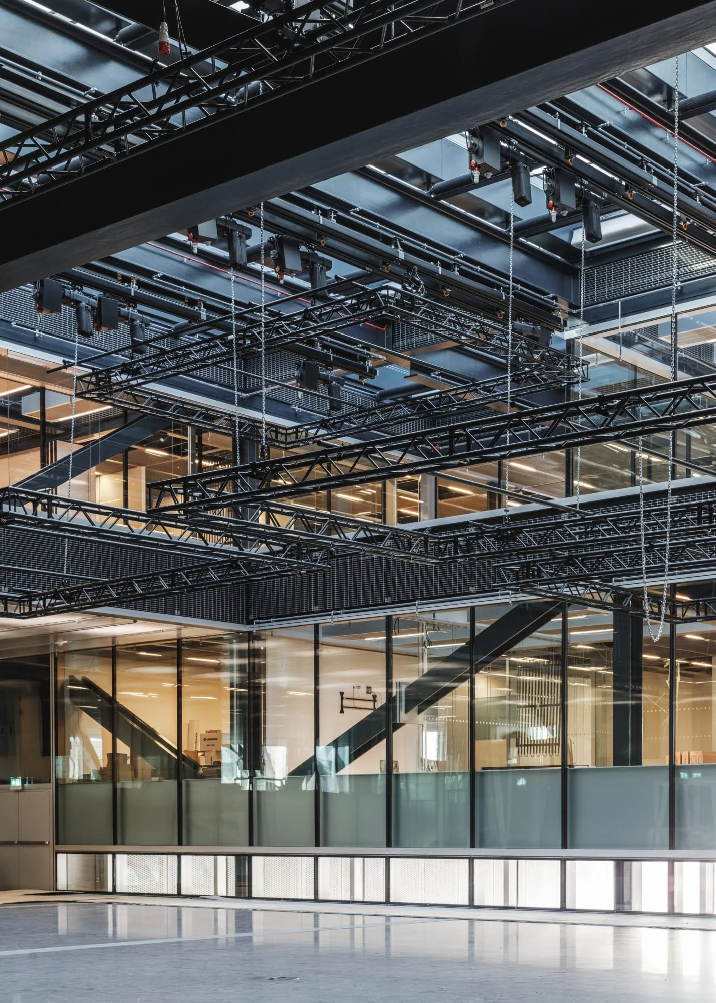 Dark grey visible structural truss - White matt & light brown leather furniture - Gold mesh acoustic ceiling