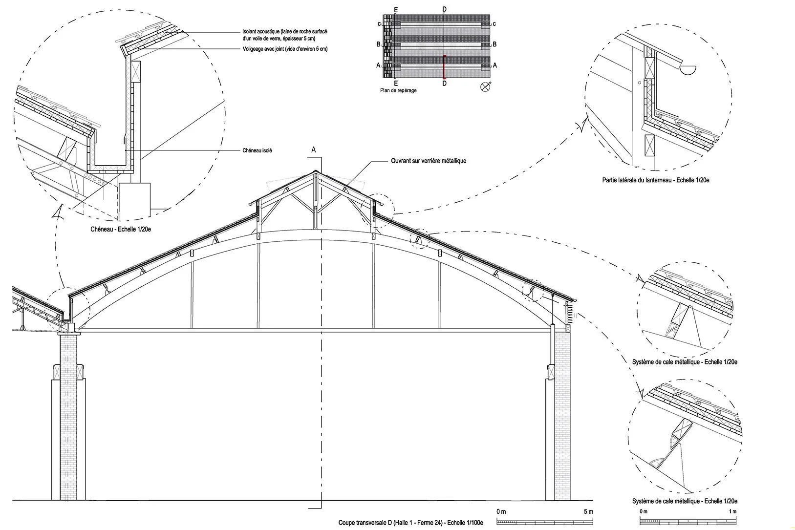 Projet (APD, 2018). Coupe transversale sur la halle Sud-est à charpente en béton